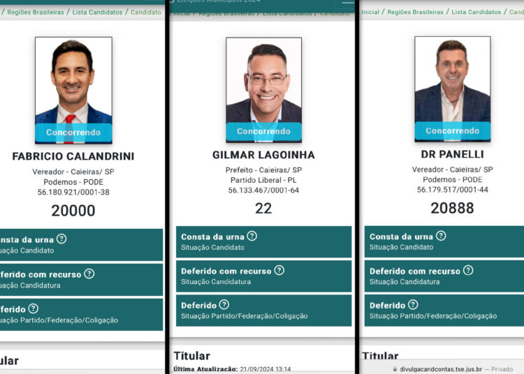 O prefeito e candidato à reeleição, Gilmar Lagoinha (PL), e dois candidatos a vereador, Fabricio Calandrini e Panelli, ambos do PODEMOS e ligados à chapa do atual prefeito, continuam com suas candidaturas classificadas como “deferidas com recurso” pela Justiça Eleitoral.