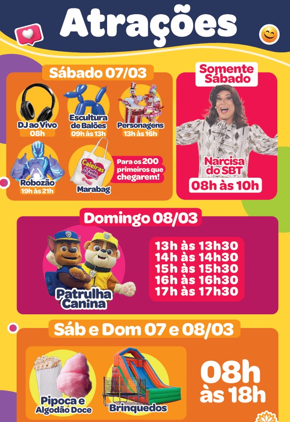 A abertura aconteceu neste sábado (7), a partir das 8h, com ofertas de inauguração e uma programação cheia de atrações para o público. Um dos destaques é a presença da Narcisa, do SBT, que participa da festa junto com outras atividades ao longo do dia.