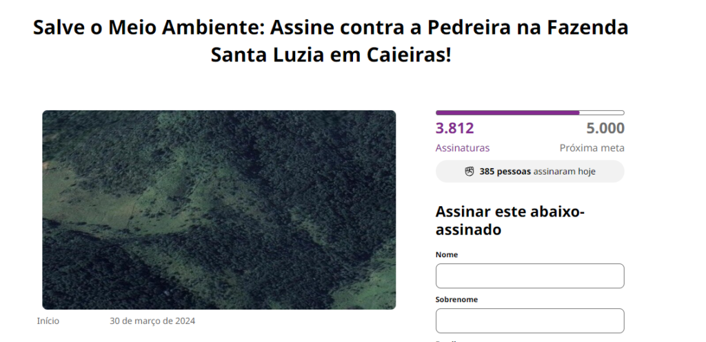 O abaixo-assinado virtual contra a instalação de uma pedreira na Fazenda Santa Luzia, em Caieiras, ganha cada vez mais adesões e já acumula mais de 3.800 assinaturas. A mobilização da sociedade civil vem em resposta à recente alteração na Lei de Zoneamento do município, aprovada pela Câmara Municipal.