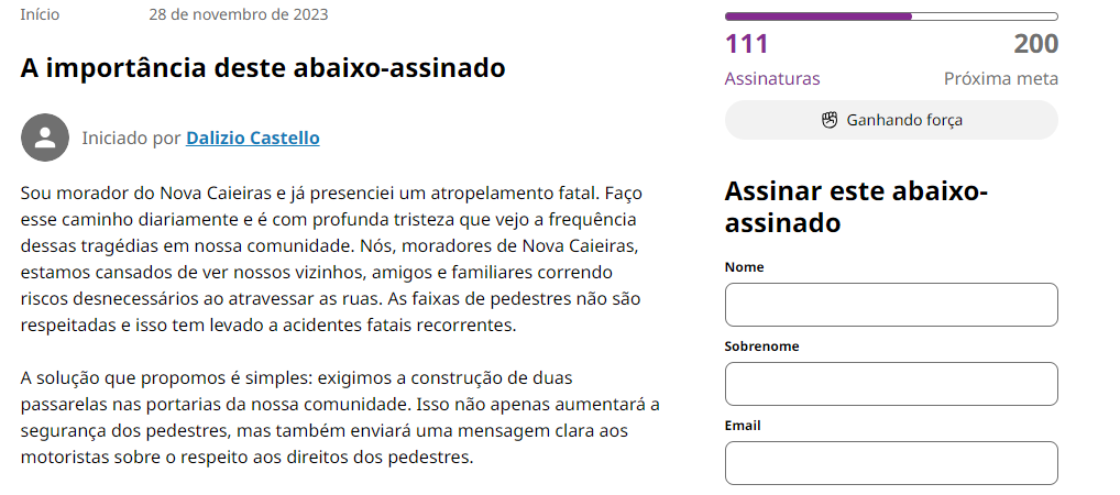 O abaixo-assinado, que já angariou mais de 100 assinaturas, destaca a urgência da implementação de medidas que possam garantir a segurança dos pedestres que enfrentam diariamente os riscos dessa travessia. O recente acidente, ocorrido em frente à entrada do bairro, serviu como um catalisador para a comunidade, que agora busca a atenção das autoridades responsáveis para a solução efetiva desse problema crônico.