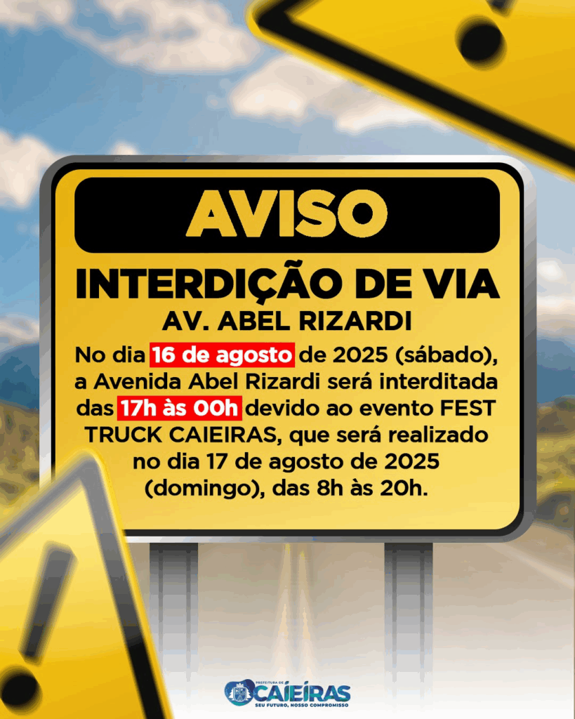 A Prefeitura de Caieiras informou que a Avenida Abel Rizardi, conhecida também como Salvador da Pátria, será interditada neste sábado, 16 de agosto, no trecho próximo ao trevo de Franco da Rocha. A interdição acontecerá das 17h às 00h.