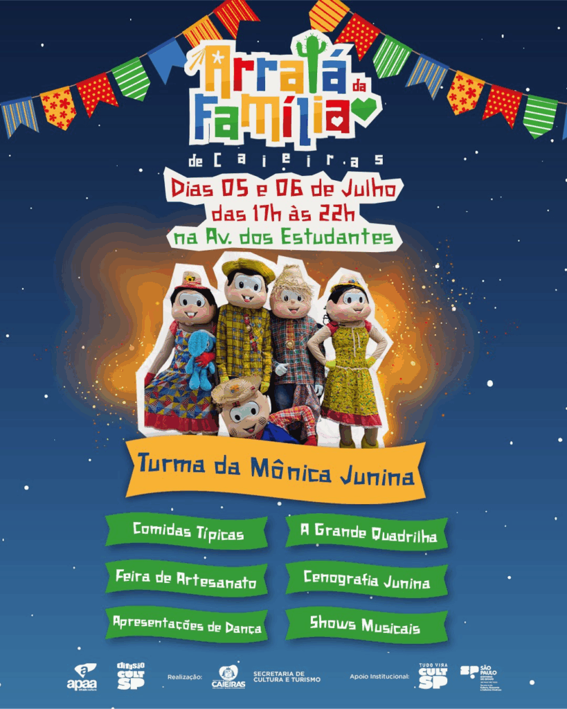 A Avenida dos Estudantes, no Centro de Caieiras, será palco do Arraiá da Família de Caieiras, que acontece neste sábado (5) e domingo (6) de julho, das 17h às 22h. Promovida pela Prefeitura de Caieiras, a festa promete animação, cultura popular e diversão para todas as idades.