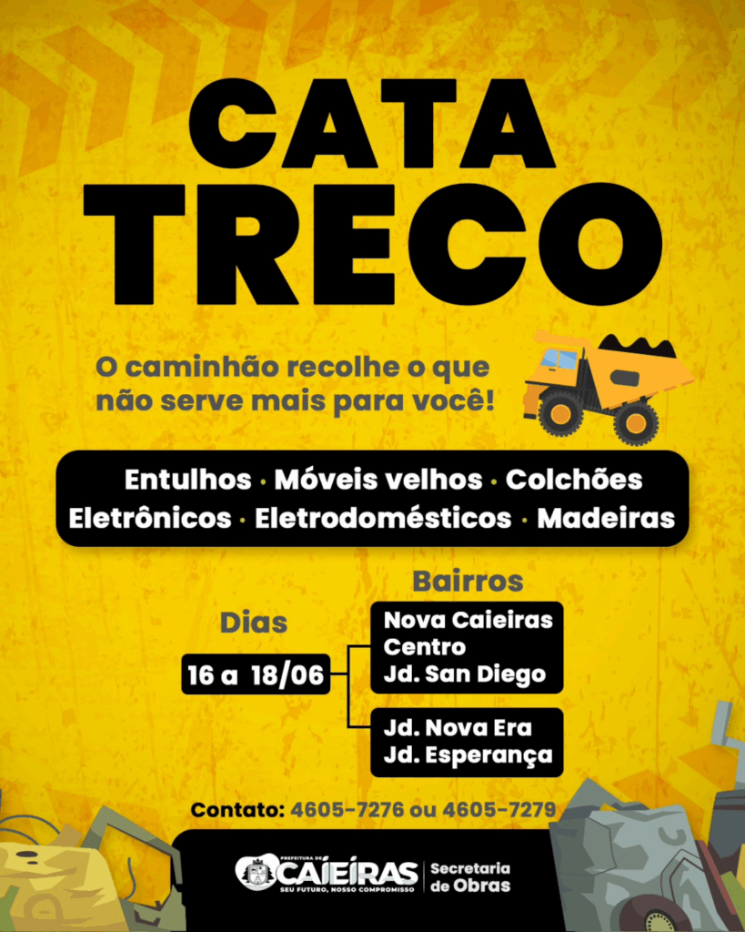 A Prefeitura de Caieiras anunciou que o serviço de Cata-Treco vai atender cinco bairros da cidade entre os dias 16 e 18 de junho.
