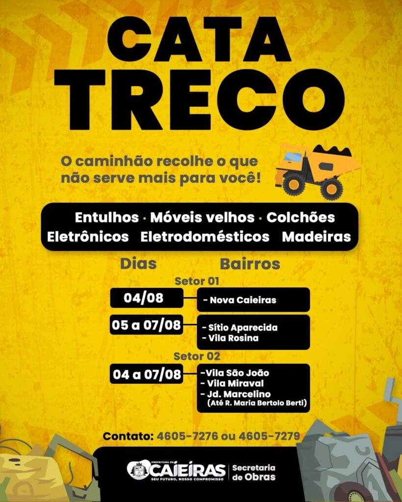 A Prefeitura de Caieiras anunciou que o serviço de Cata-Treco vai atender diversos bairros da cidade entre os dias de 04 a 07 de agosto