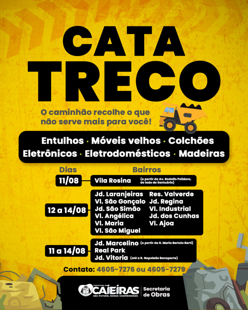 A Prefeitura de Caieiras anunciou que o serviço de Cata-Treco vai atender diversos bairros da cidade entre os dias de 11 a 14 de agosto