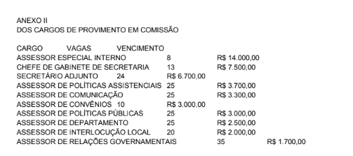 O projeto foi responsável pela criação de diversos cargos, entre eles, 8 vagas para assessor especial interno com vencimentos de R$14.000,00.