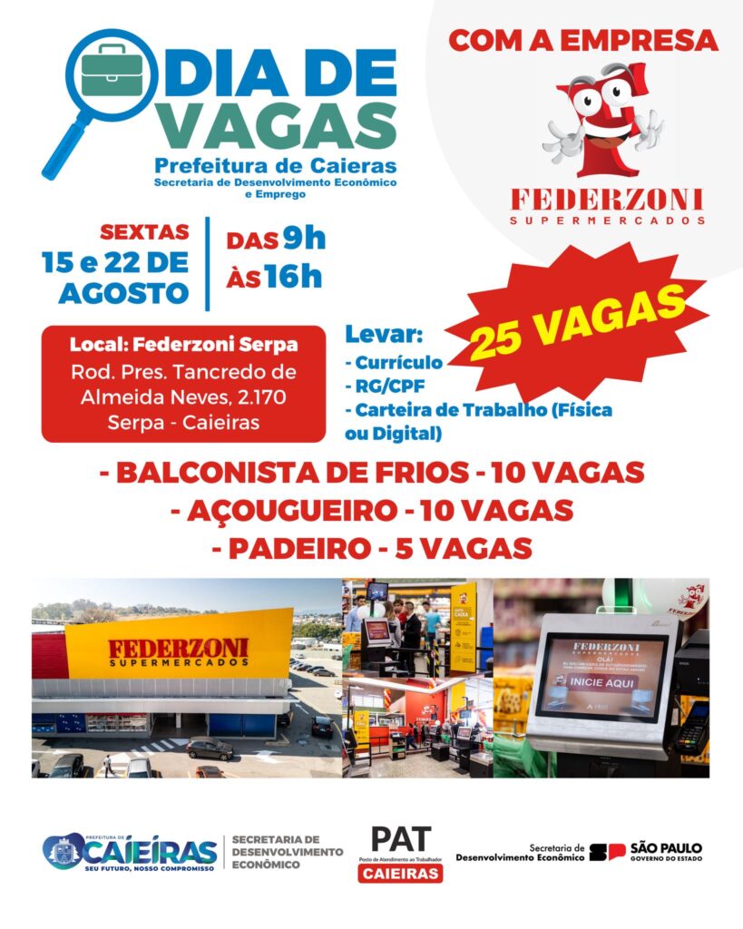 A Prefeitura de Caieiras anunciou, por meio de suas redes sociais, mais uma edição do mutirão de empregos “Dia de Vagas”. Desta vez, serão oferecidas 25 vagas de trabalho no Federzoni Supermercados, com início imediato.