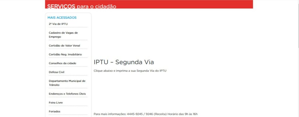 Estou tentando emitir a 2 via do IPTU mas não estou conseguindo devido ao site estar com problemas, a Prefeitura deveria prorrogar o vencimento já que o problema não e nosso e sim da Prefeitura e se você não pagar na data do vecto ainda pagamos multa, isso e um absurdo uma cidade pequena com esses problemas. Agora tenho que me deslocar até a Prefeitura para emitir a 2 via, tenho que me dispor de um tempo que eu não tenho para resolver esse assunto, vocês responsáveis deveriam ter um mais de visão para esse assunto e ainda tentamos entrar em contato e ninguém atende, vamos colocar mais pessoas para trabalhar e ter um atendimento eficiente e pratico. Essa segunda gestão começou muito mal no ano de 2025.