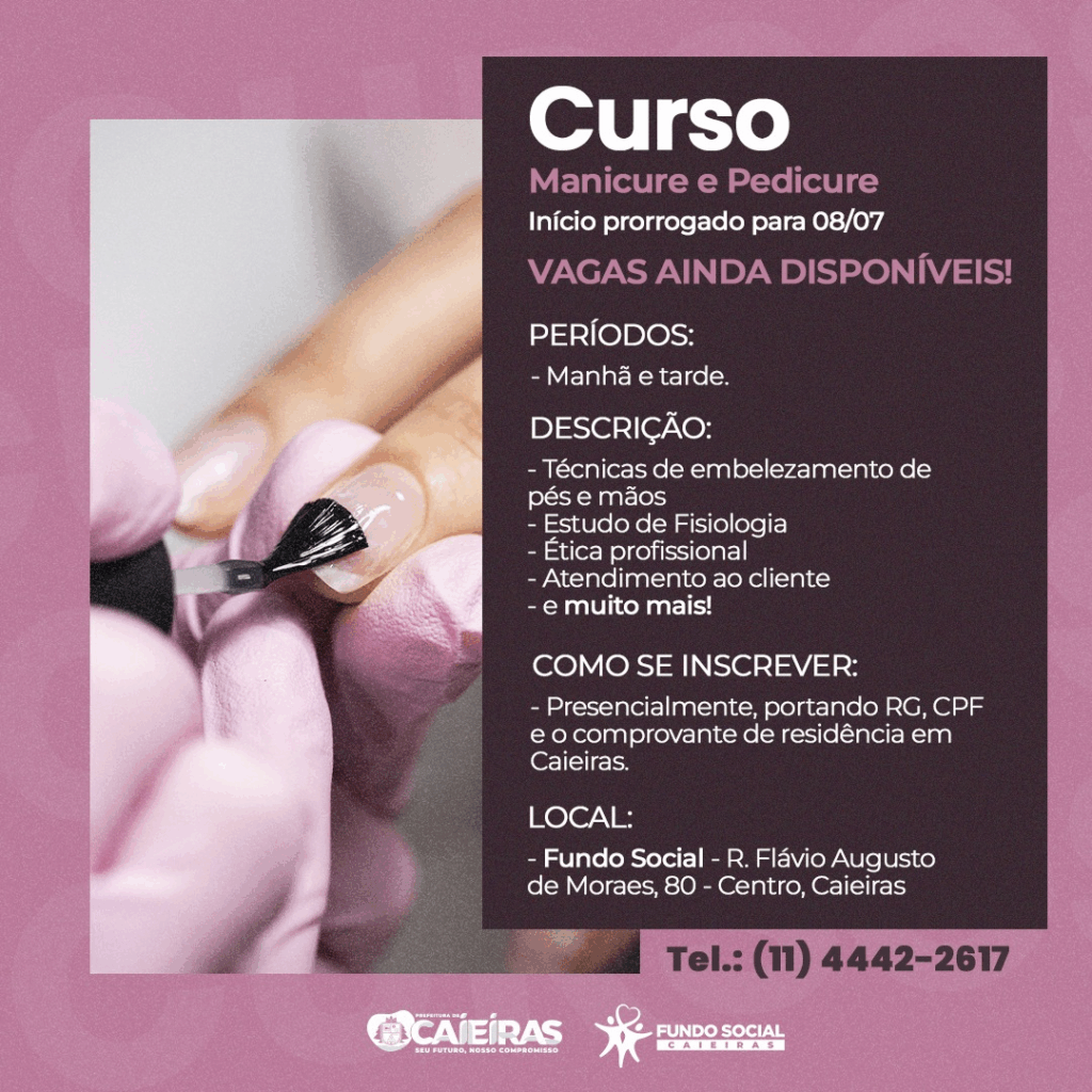 A Prefeitura de Caieiras anunciou neste domingo (29), por meio das redes sociais, a abertura das inscrições para o curso gratuito de Manicure e Pedicure, promovido pelo Fundo Social de Solidariedade. A iniciativa visa oferecer capacitação profissional para moradores da cidade que desejam ingressar no mercado de beleza e estética.
