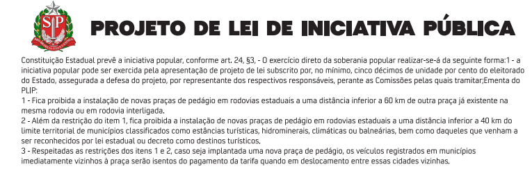 A campanha de coleta de assinaturas durará por no máximo 60 dias, prazo necessário para que seja encaminhado à Assembleia Legislativa e, consequentemente, votado a tempo de impedir a assinatura do contrato de concessão das rodovias e construção das praças de pedágio pelo governador Tarcísio de Freitas e pela empresa vencedora da licitação.