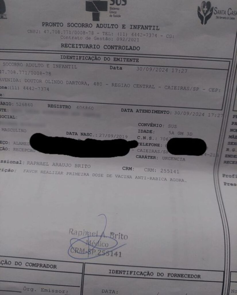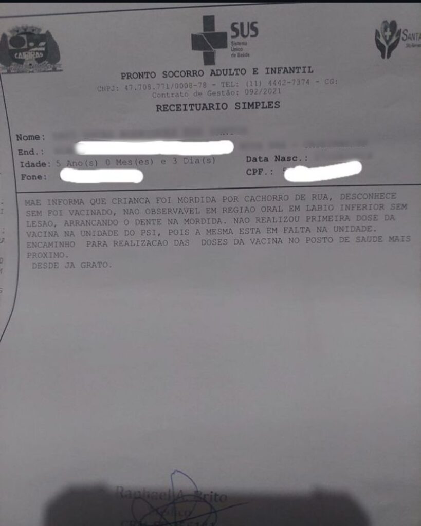 De acordo com o relato, após a mordida, ela levou seu filho ao Novo Pronto Socorro, onde foi informada que não havia a vacina antirrábica humana, necessária em casos de mordidas de animais.