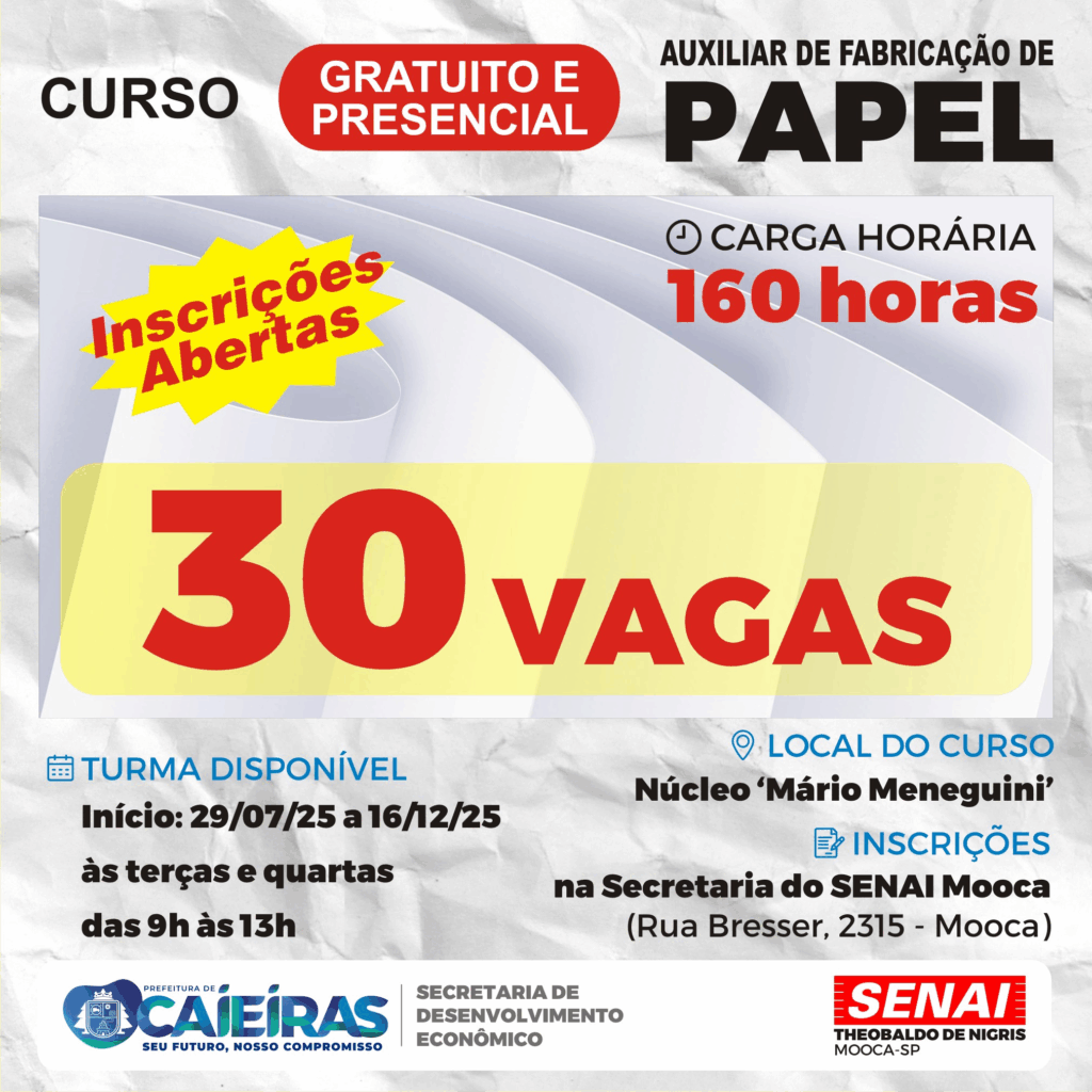 A Prefeitura de Caieiras anunciou, por meio de suas redes sociais, a abertura das inscrições para o curso gratuito de Auxiliar de Fabricação de Papel, promovido em parceria com o SENAI Theobaldo de Nigris.