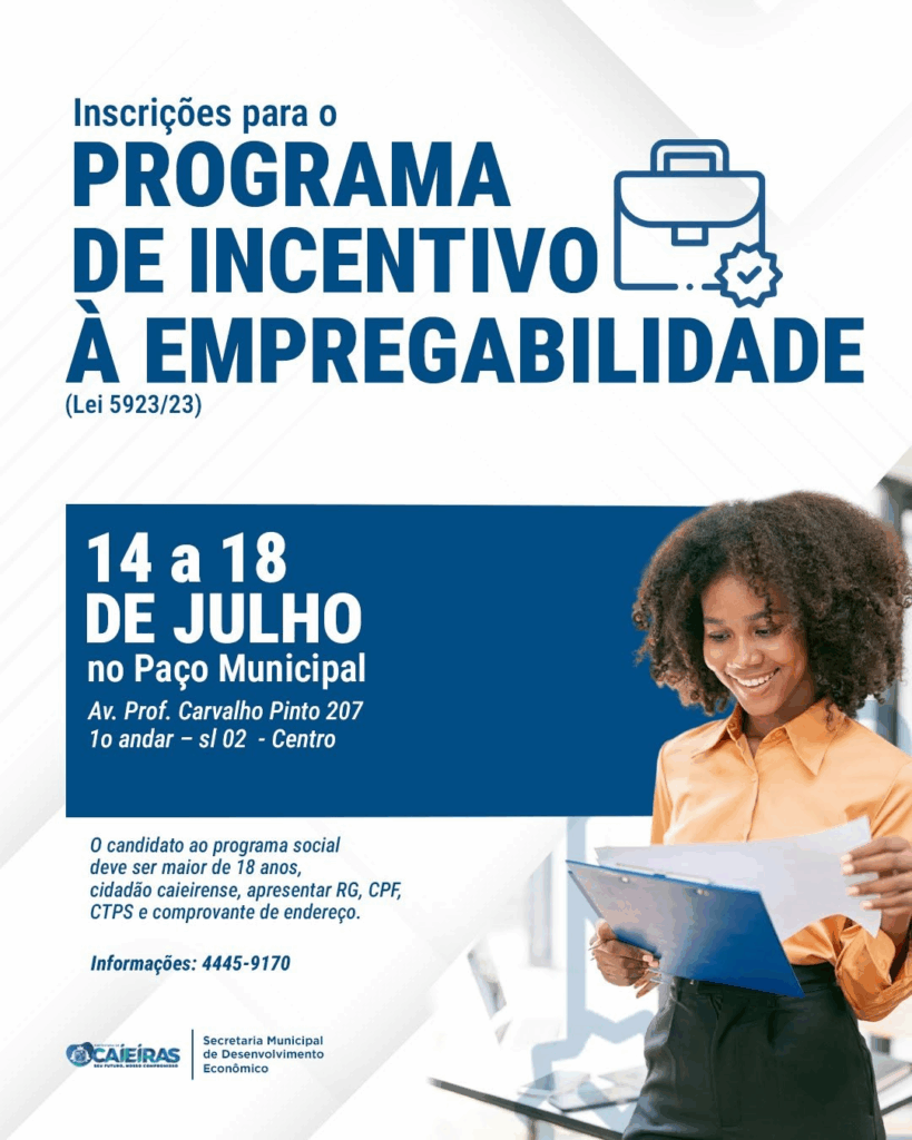 A Prefeitura de Caieiras inicia nesta segunda-feira, 14 de julho, as inscrições para o Programa de Incentivo à Empregabilidade. O programa garante uma bolsa-auxílio mensal de R$700, além de outros benefícios sociais e profissionais.