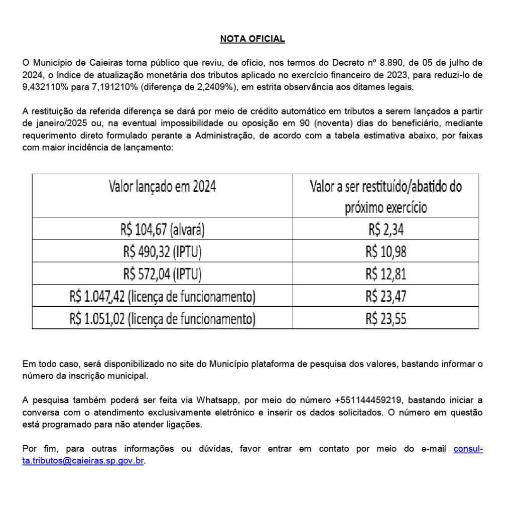 A Prefeitura de Caieiras publicou na edição de ontem da Imprensa Oficial do Município, uma Nota Oficial informando que “reviu o índice de atualização monetária dos tributos aplicado (sic) no exercício de 2023, reduzindo-o numa proporção de 2,2409%”.