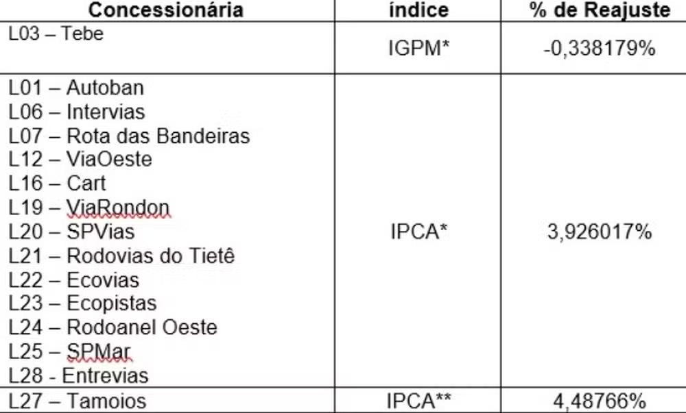Por outro lado, o menor reajuste, de apenas 0,3%, será observado nas rodovias sob concessão da Tebe, que ligam Bebedouro, Barretos, Catanduva, Pirangi e Taquaritinga.