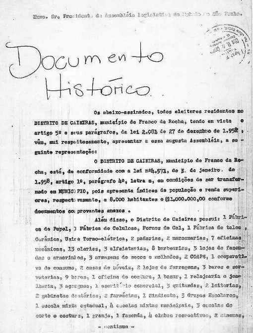Em 1958, os moradores do até então “Distrito de Caieiras”, do município de Franco da Rocha, criavam o abaixo assinado pedindo a emancipação do município.