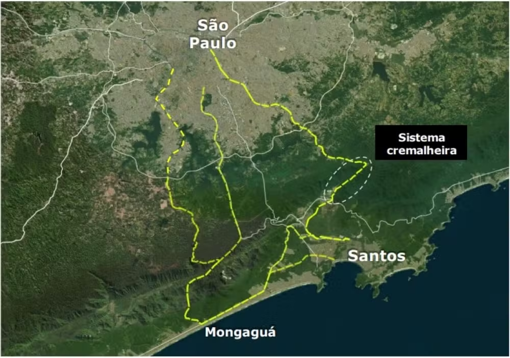O projeto foi aprovado pelo Programa de Parcerias de Investimentos do Estado de São Paulo (PPI-SP) em maio de 2024 e está sendo conduzido pelo Banco Interamericano de Desenvolvimento (BID). Três trajetos possíveis foram apresentados para conectar a capital ao litoral paulista, com distâncias variando entre 80 e 130 km.